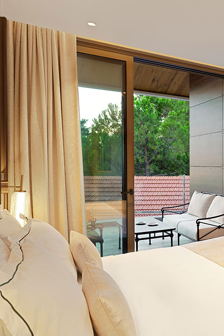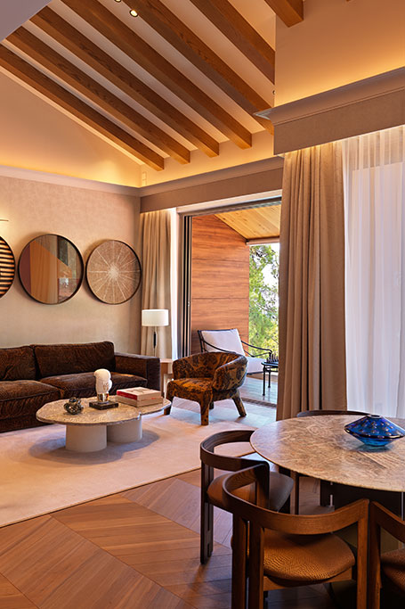 A true haven of light awaits you on the fifth floor of the resort. Enjoy breathtaking views and immerse yourself in an opulent space, curated with natural materials and colours creating a refined graceful aesthetic. These 52 sqm suites feature one-bedroom, separate living area, high attic-style ceilings and a private veranda overlooking the pool area and pine covered hills. Ideal for couples, families of up to five persons or small groups, the Suites are designed for those seeking extra space and comfort with a serene pool facing views.