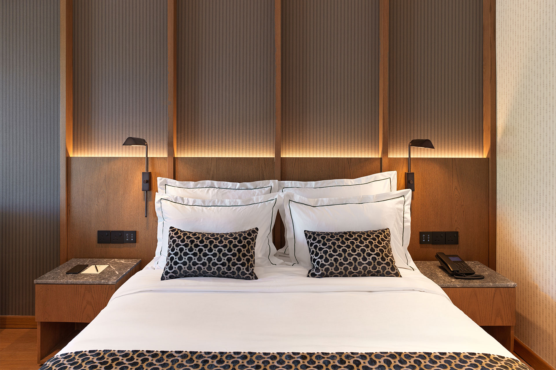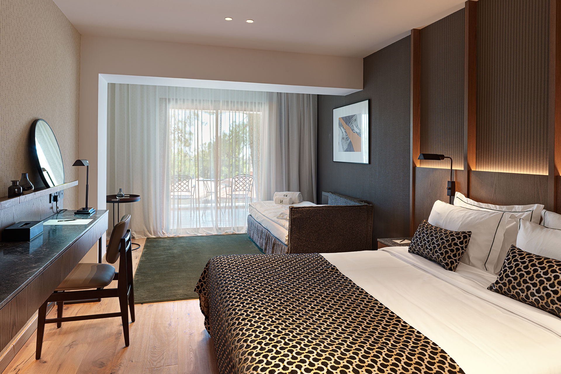 Experience elevated mountain hospitality in one of our 25 Superior Rooms (26-32 sqm) that enjoy pool view. Each space blends the serene charm of the Troodos landscape with contemporary design and bespoke luxury. Natural textures and clean lines reflect the surrounding forested hills, while curated furnishings ensure refined comfort for every type of traveller. From the room’s balcony or terrace you can enjoy the most idyllic sunsets offering a breathtaking spectacle of vibrant colours painting the sky as daylight fades. Located on the 2nd, 3rd, and 4th floors, they are designed for couples and families up to 3 people. Includes the option of a sofa bed in selected units(note 2), ideal for accommodating an extra person.